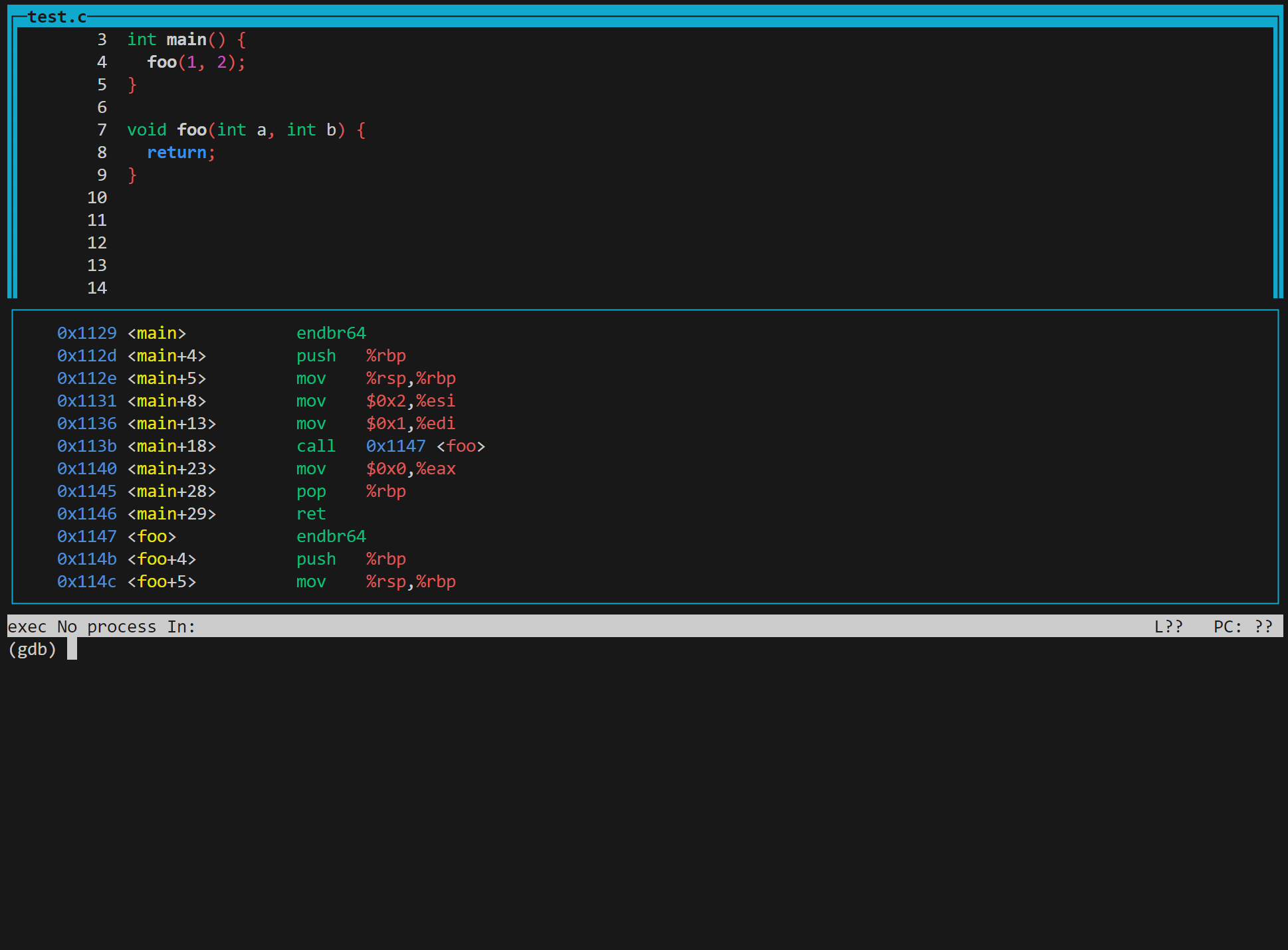rip = 0x555555555155 in foo (test.c:8); saved rip = 0x555555555140