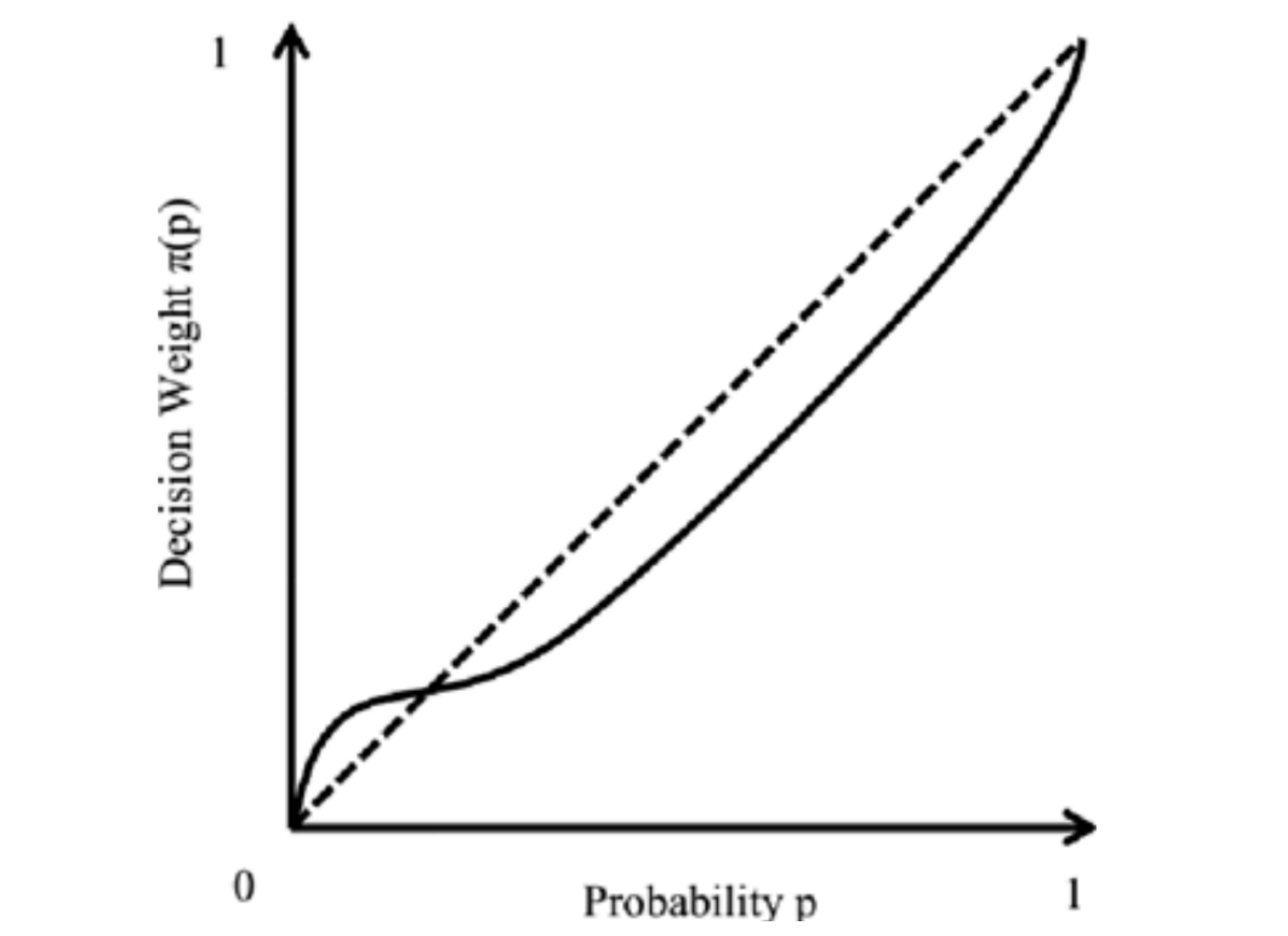 这让我们意识到其实在人真正考虑概率的时候,将“小概率发生”和“完全不发生”是分的很明确的。因为上面那个例子很多人时看到 D 项中有 \(1\%\) 的概率拿不到钱而去选 C 项。解决方法是我们对概率需要加一个修正函数 \(\pi(p)\),使得我们的 utility function 变为 \(u(x)\times\pi(p)\)。这个 \(\pi\) 函数在 \(p=0\) 的时候会有一个陡增。