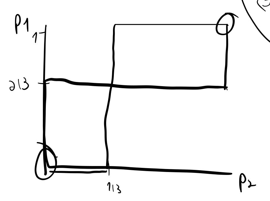 交点为 \((0, 0), \left(\frac{1}{3}, \frac{2}{3}\right), (1, 1)\),所以这三个点是 Nash equilibrium。