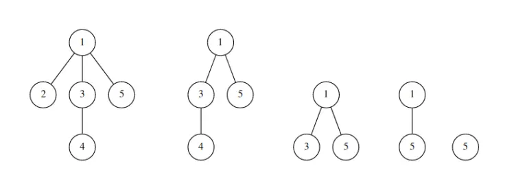 例如对于上图中的树,它的删除序列为:2 4 3 1 5。