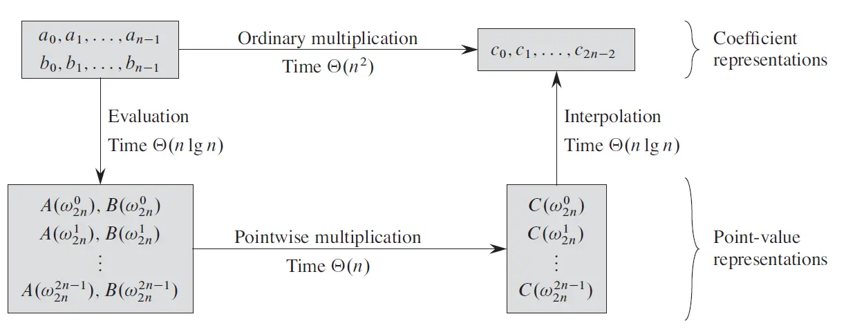 系数表达就是把 A ( x ) = ∑ i = 0 n − 1 a i x i A(x) = \sum_{i=0}^{n-1}a_ix^i A ( x ) = ∑ i = 0 n − 1 a i x i 记录为 ( a 1 , a 2 , ⋯ , a n − 1 ) (a_1,a_2,\cdots,a_{n-1}) ( a 1 , a 2 , ⋯ , a n − 1 ) 。朴素算法需要O ( n 2 ) \mathcal{O}(n^2) O ( n 2 ) 进行乘法。